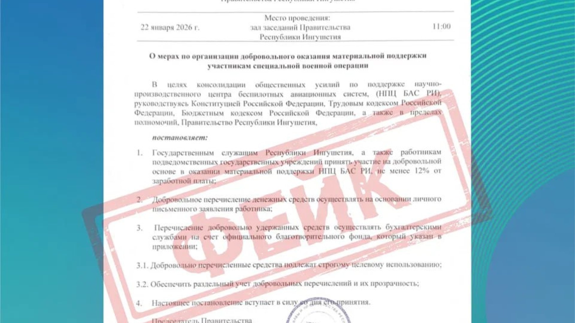 В мессенджерах и соцсетях распространяется фальшивое постановление правительства республики о поддержке центра БАС, сообщил ЦУР.