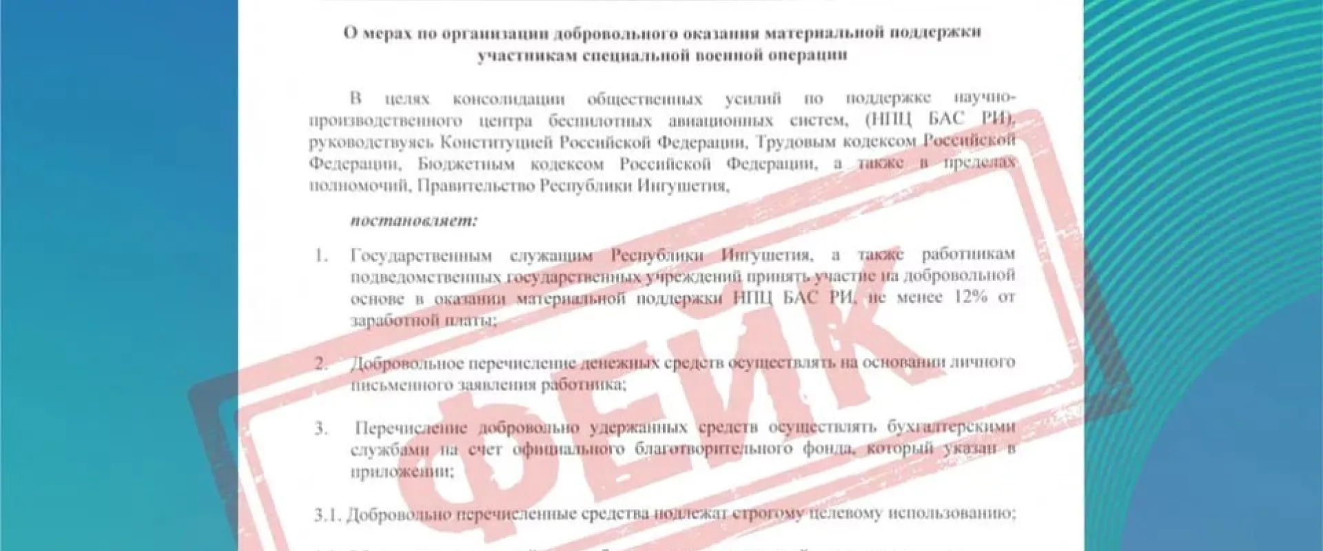 «В правительстве не издавалось и не готовится постановление об обязательном или так называемом «добровольном» удержании 12% от заработной платы государственных служащих в пользу каких-либо фондов или предприятий», — заявил он газете «Ингушетия». По его словам, содержание распространяемого документа противоречит нормам российского трудового и бюджетного законодательства.