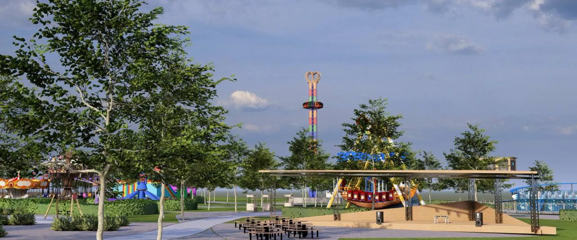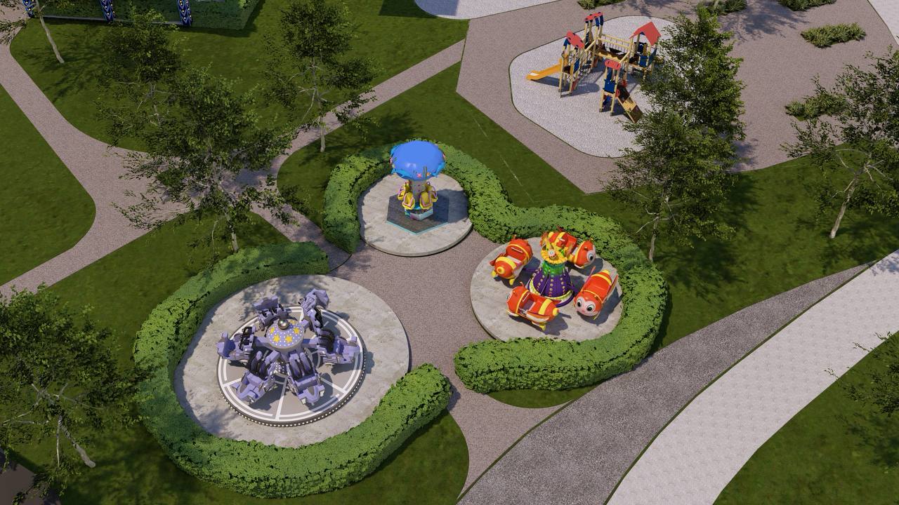 В обновленном парке появятся игровые зоны для разных возрастов, крытые модули, лазерные и экстремальные аттракционы. Также будут обустроены освещенные аллеи, места для отдыха, торговые точки и сцена для мероприятий.