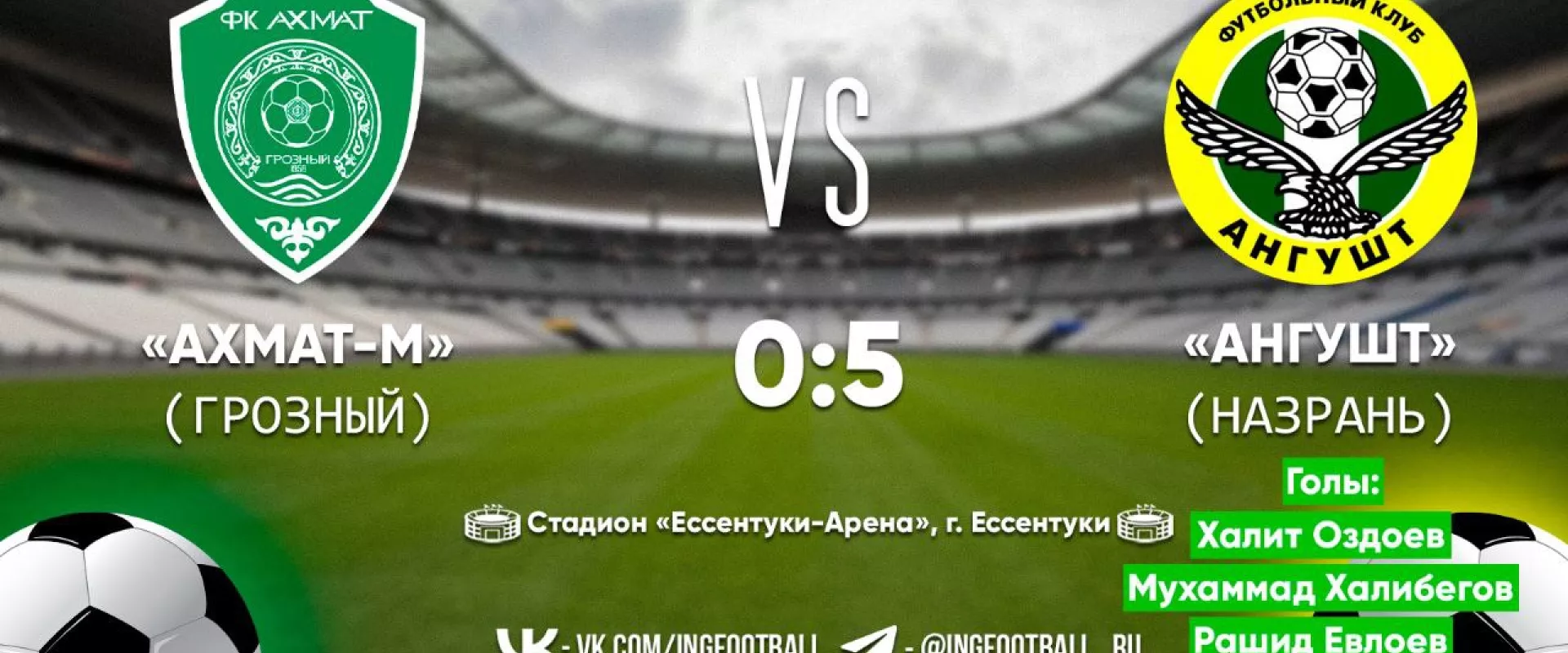 «Ангушт» из Назрани одержал победу над «Ахмат‑М» со счётом 5:0 в контрольном матче на стадионе в Ессентуках.