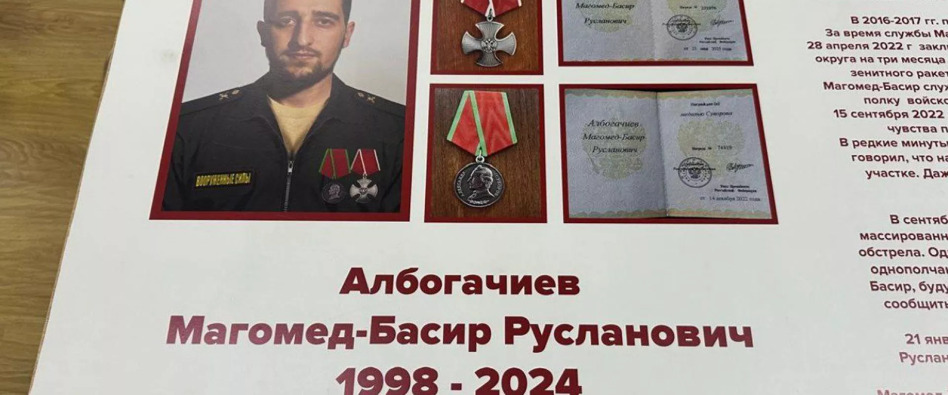 Официальное подтверждение гибели Албогачиева при исполнении долга семья получила 21 января 2025 года. За проявленные героизм и отвагу он был посмертно награжден Медалью Суворова и Орденом Мужества.