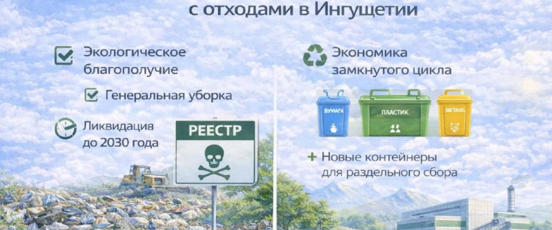 Также подготовлен проект строительства современного комплекса по обработке и размещению ТКО. Он будет расположен в сельском поселении Верхние Ачалуки Малгобекского района.